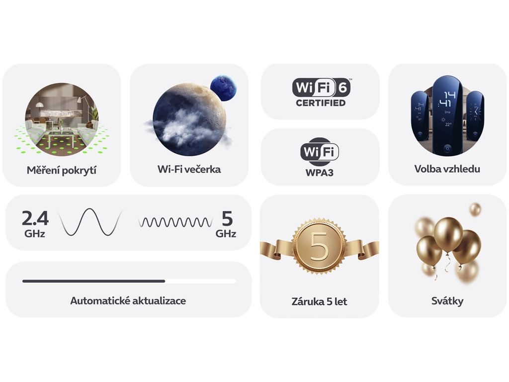 - Podpora standardů: IEEE 802.11a/b/g/n/ac (Wi-Fi 5) a 802.11ax (Wi-Fi 6)